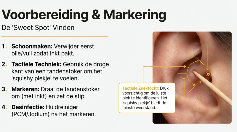 Voor het markeren wordt vaak gewerkt met een gesteriliseerde tandenstoker met gentiaanviolet. Dat klinkt simpel, maar het is een slimme precision-move: je kunt voelen waar de kraakbeenrand loopt en exact markeren zonder te “prikken”.