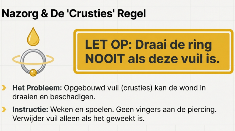Als er vuil op de ring blijft zitten en de ring draait (per ongeluk of “even”), kan dat vuil in de verse wond worden getrokken → irritatie en gedoe.