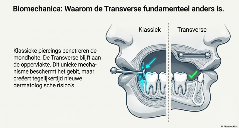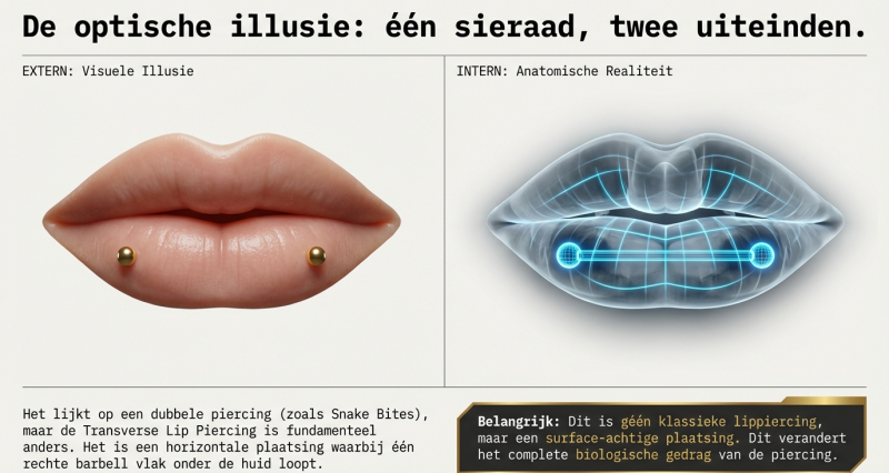Hier komt het eerste studiogeheim: de transverse lippiercing is technisch gezien geen dubbele piercing, maar een surface piercing. Er loopt één horizontale barbell dwars door het weefsel van je onderlip. De uiteinden die je ziet, zijn verbonden door een staafje dat net onder de huid ligt.