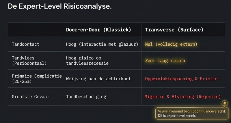 Bij de transverse variant ruil je dit tandvleesrisico in voor het risico op migratie. Het is een bewuste keuze tussen anatomische veiligheid van de tanden en de esthetische houdbaarheid van de huid.
