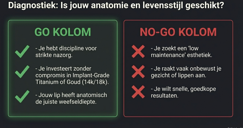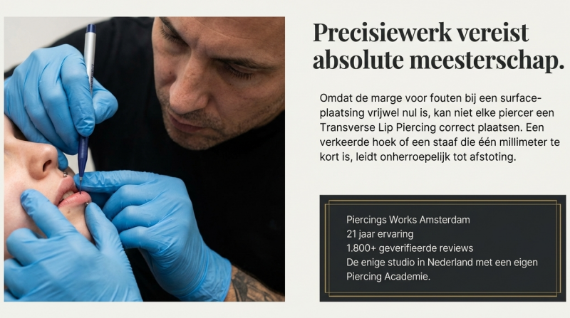"Niet elke lip is geschikt en niet elke piercer kan dit correct plaatsen. Dit begrijpt bijna niemand; dit is expert-level kennis die het verschil maakt tussen een pronkstuk en een litteken."