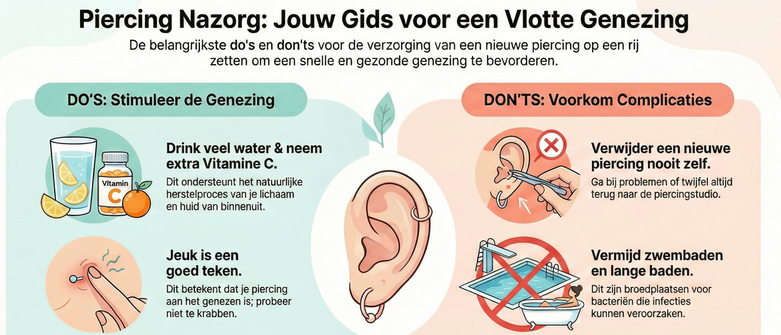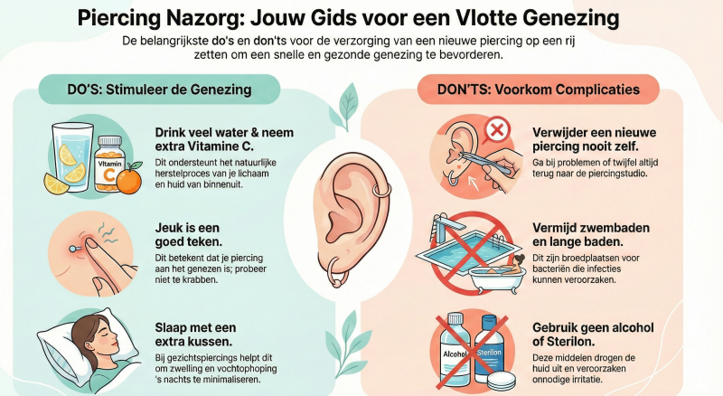 Gefeliciteerd met je nieuwe aanwinst! Of het nu een subtiel knopje in je oor is of een stoere navelpiercing, je wilt natuurlijk dat deze zo snel en mooi mogelijk geneest. Een goede nazorg is het halve werk. In deze blog zetten we de belangrijkste do’s en don’ts op een rij voor een spoedig herstel.