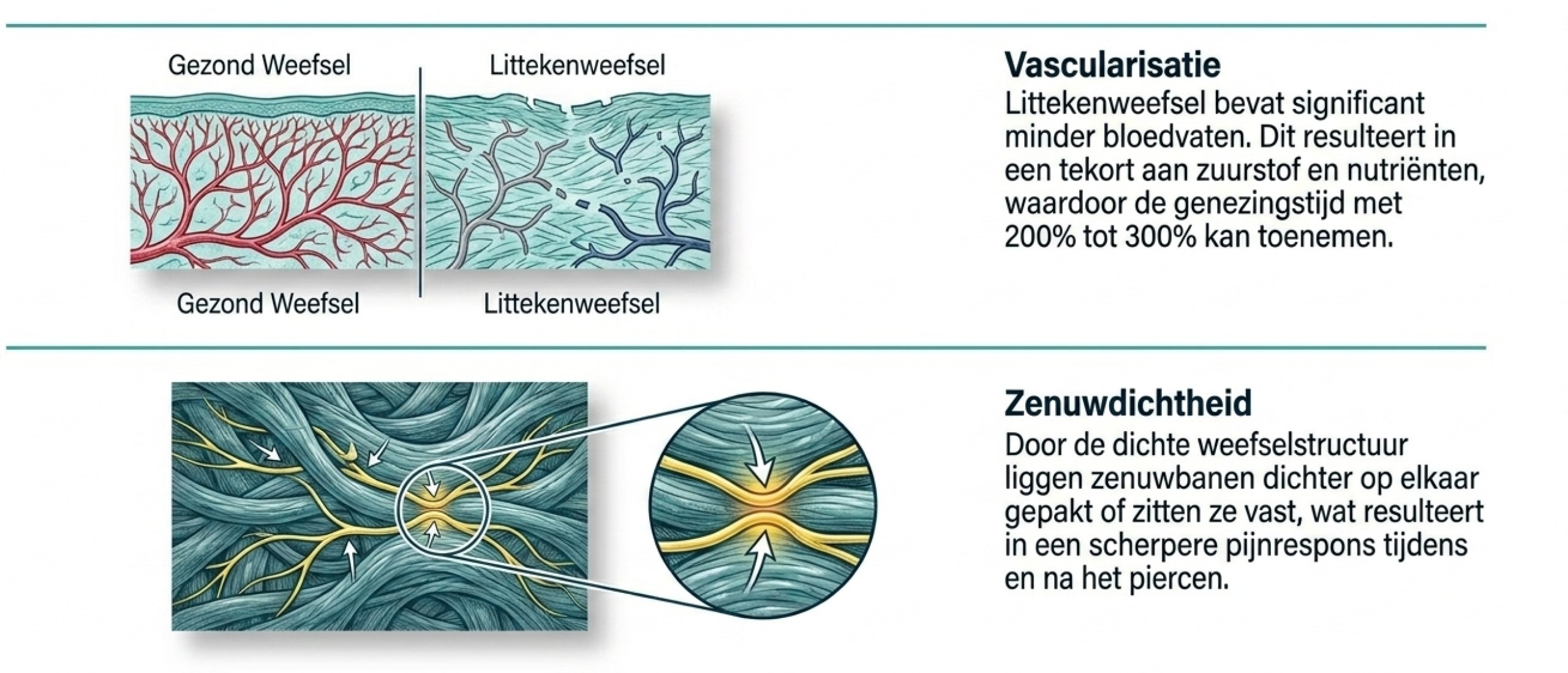 Normaal weefsel heeft een rijke vascularisatie (bloedvoorziening) en een georganiseerd netwerk van collageen en elastine. Bij littekenweefsel is de vascularisatie echter drastisch verminderd. De collageenstructuur is gedesorganiseerd; de bundels liggen kriskras door elkaar in plaats van in een netjes gevlochten patroon. Dit resulteert in weefsel dat stijf, fiberachtig en minder elastisch is. Voor een piercing betekent dit dat de huid minder stabiel is, wat direct invloed heeft op de verankering van een sieraad.