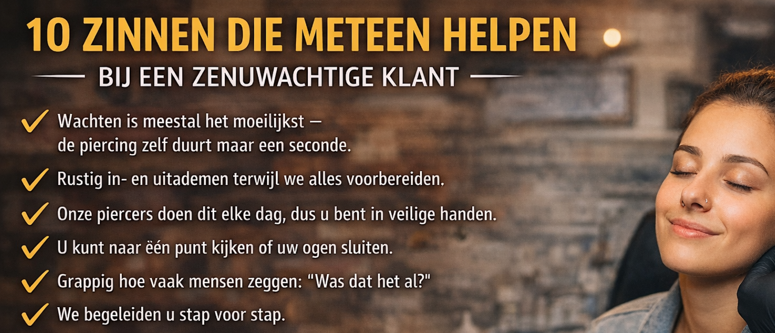 Wanneer deze zinnen rustig, iets langzamer en met een vriendelijke toon worden uitgesproken, gaat de klant vaak automatisch rustiger ademen. Dat helpt om spanning te verminderen vóór de piercing.